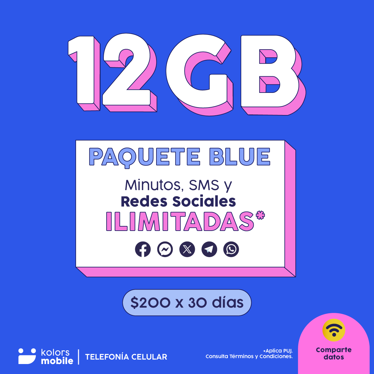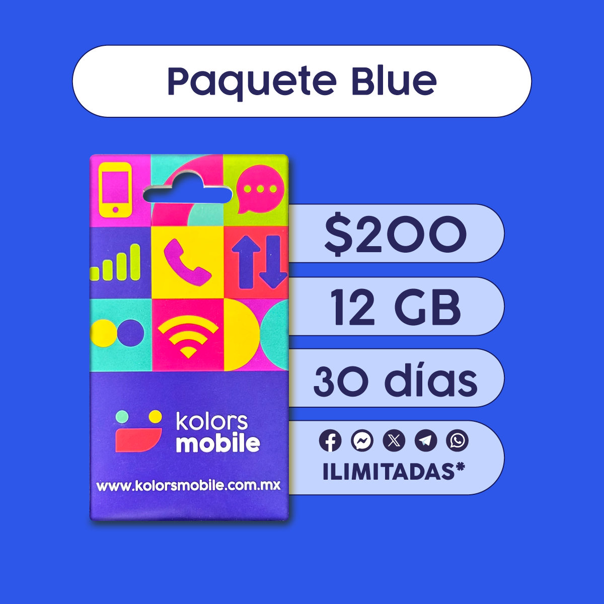 SIM (de Regalo) + Paquete Blue-> 12 GB + Redes Sociales Ilimitadas + Minutos y SMS ilimitados - 30 días / Cobertura México, USA & CAN. ¡Con Portabilidad te damos 36GB!
